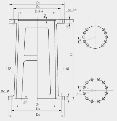 注:WJ型、DJ型、DXJ型-30A/B、35A、40B、45A四種機(jī)架底面為Ⅰ型和Ⅱ型(Ⅰ型不須標(biāo)柱,Ⅱ型須在型號(hào)后面注Ⅱ、Ⅱ型a°=30°,n2-φ為12-14)其余機(jī)架為Ⅱ型(不須標(biāo)注)