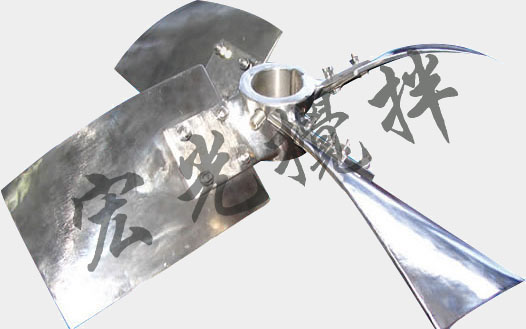 外緣的圓周速度一般為5~15m/s。旋槳式攪拌器主要造成軸 向液流,產(chǎn)生較大的循環(huán)量,適用于攪拌低粘度(<2Pa·s)液體、乳濁液及固體微粒含量低于10%的懸浮液。攪拌器的轉(zhuǎn)軸也可水平或斜向插入槽內(nèi),此時液流的循環(huán)回路不對稱,可增加湍動,防止液面凹陷。